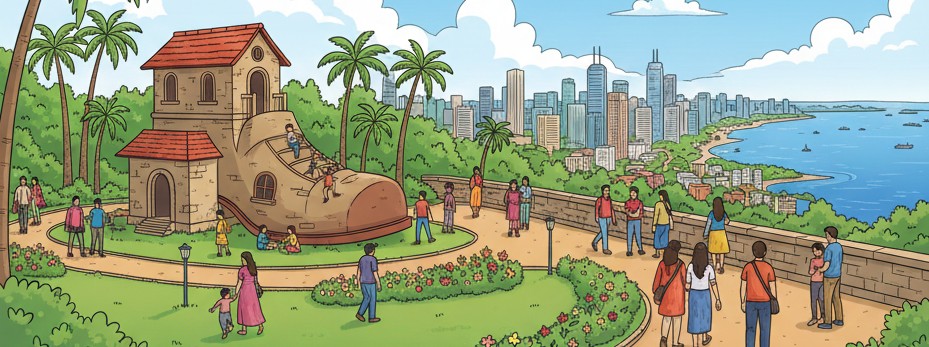 Spread across lush greenery, it offers spectacular views of the Arabian Sea and the curving Queen’s Necklace along Marine Drive. The park is famous for its playful “Old Woman’s Shoe” structure, inspired by the classic English nursery rhyme “There was an old woman who lived in a shoe.” This large, shoe-shaped house allows children to climb, explore, and play, making it one of the most photographed spots in Mumbai.